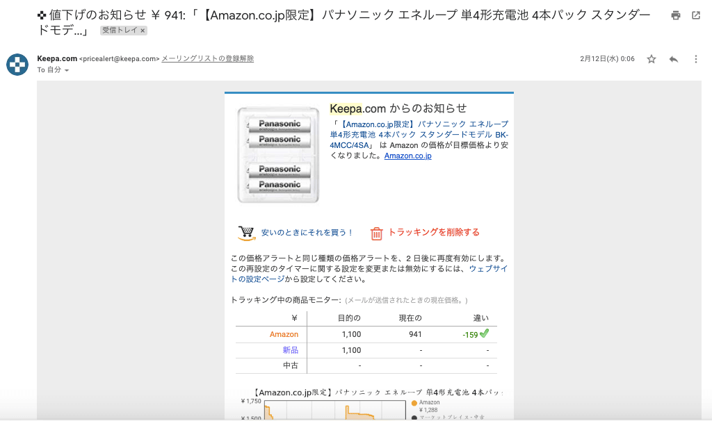 Keepaは、自分が指定した価格以下になった際にメールで通知を送ってくれます。