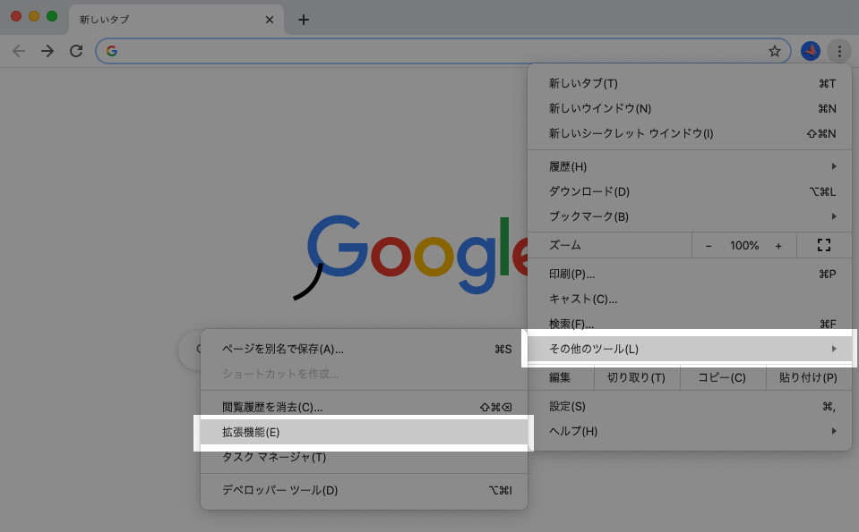 GoogleCromeの拡張機能の入り口は右上の設定ボタンです。