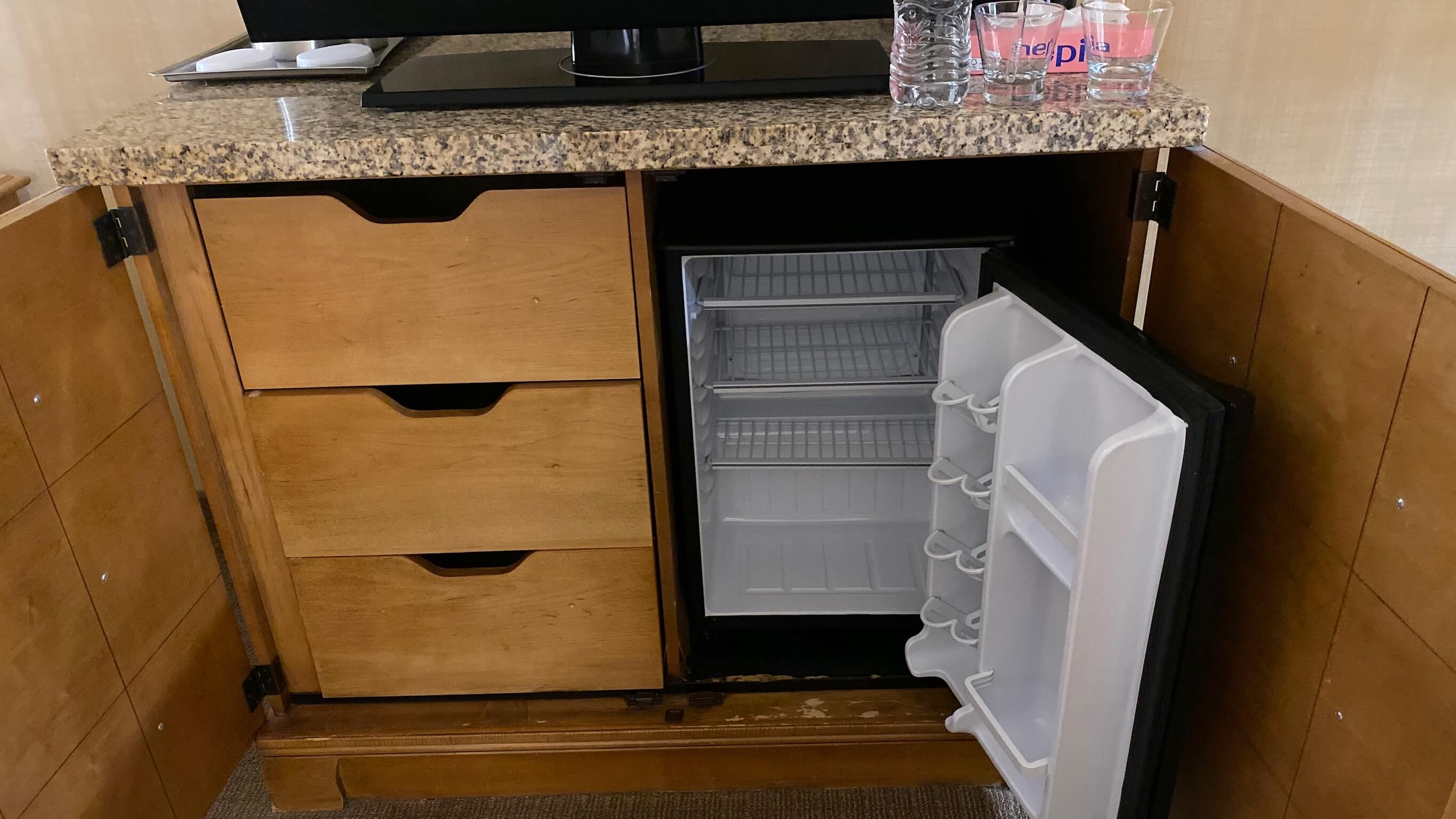 ミネラルウォーターは2本冷蔵庫近くにグラス(2個)と共に置かれています。