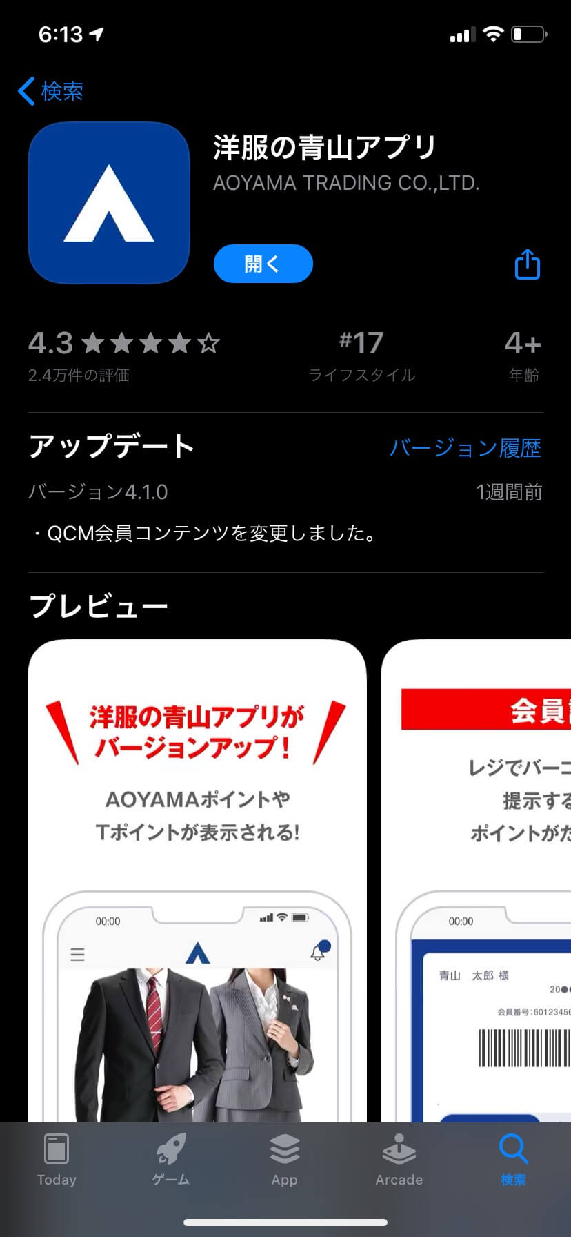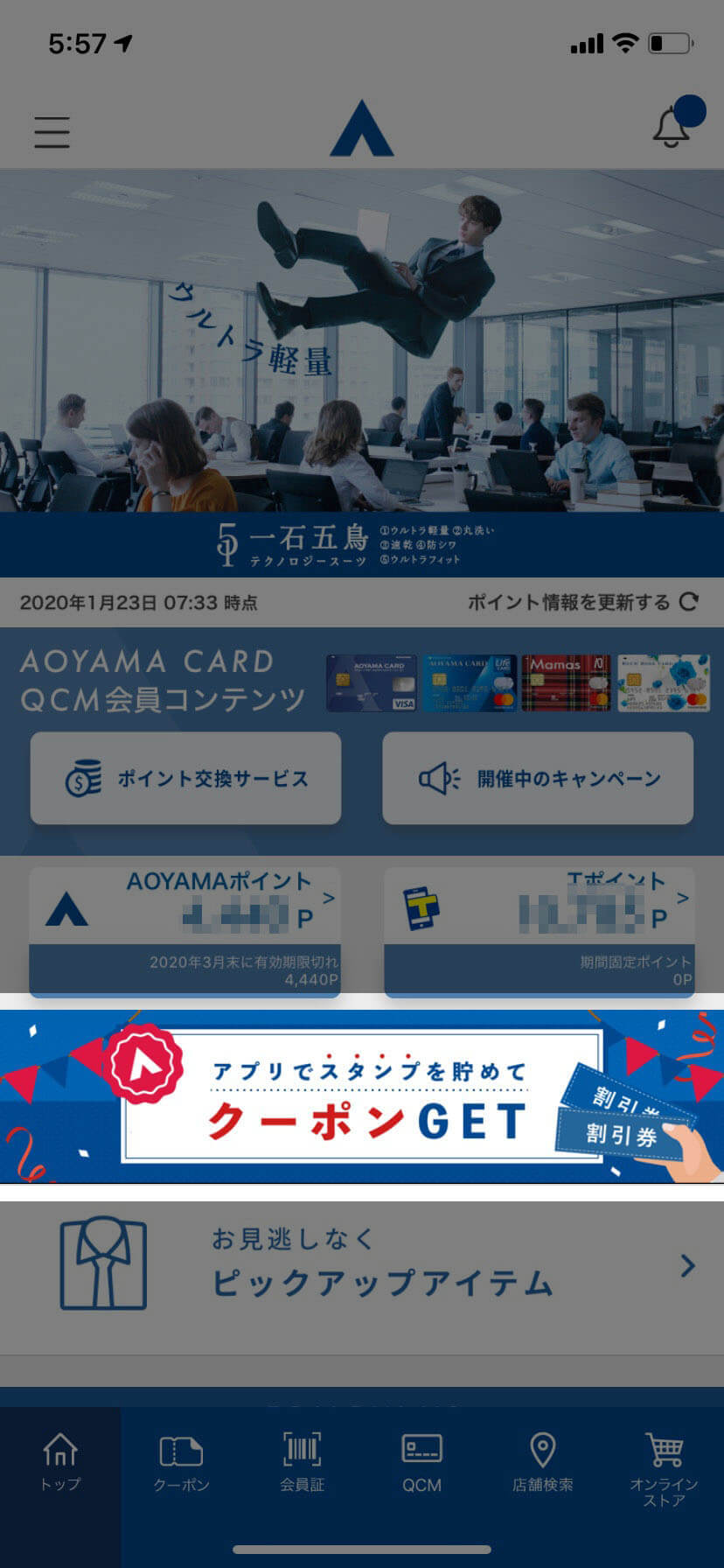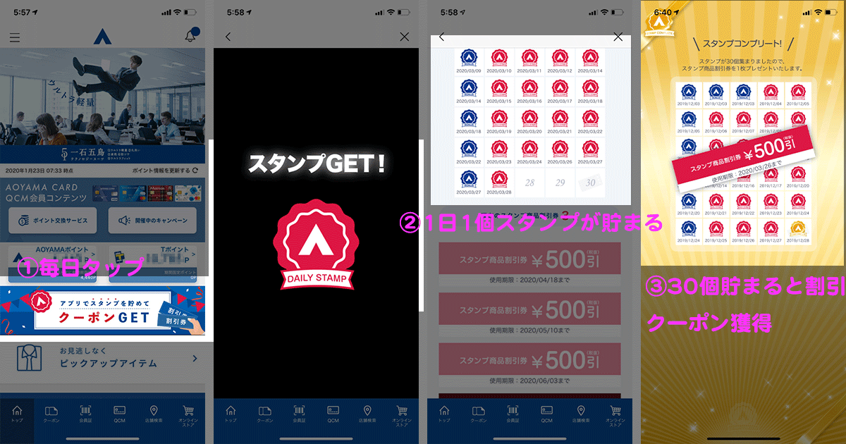 AOYAMAライフマスターカード 誕生月で10%OFF、通常の買い物で5%OFFの割引を受ける事ができます。 » 初年度無料のAOYAMAライフマスターカードの詳細はこちら 洋服の青山で今後もスーツを買い続けようと思っている人には、必ず持っていた方が良いカードです。 ただ、「特別割引」と聞くと空港ラウンジの様にハードルがかなり高いのでは?と身構えてしまいますよね。 安心してください。 AOYAMAライフマスターカード そして、「せっかくクレジットカードを作るのであれば、お得に申込をしたい!」と思いますよね。 そんな方に、当サイト経由限定の申込特典を紹介します。 ↓詳細はコチラ↓ これは、先ほど説明したAOYAMAライフカード割引の割引額を+5%増額できる方法です。 つまり、誕生月に15%OFF、通常で10%の割引を受けることができます。 もし提携している場合は、店舗スタッフに「AOYAMAタイアップカードへの切替をしたい」旨を申し出ましょう。 「AOYAMAカード」もしくは「AOYAMAタイアップカード」を1年間継続で保有すると、毎年12月頃に3,000円分の特別商品割引券がもらえます。 この商品券は基本的に、現金と同じ扱いで使用する事ができます。 利用に際しての注意書きは以下画像を御覧ください。 上記、3,000円分の特別商品割引券とともに特別商品優待券が送られてきます。 特別優待券とは、「いつでも1回、誕生日割引」を受けられる券です。 つまり、AOYAMAカードの誕生月割引10%OFFやAOYAMAタイアップカードの誕生月割引15%OFFをいつでも1回、誕生月以外の日に、適用することができるのです。 利用に際しての注意書きは以下画像を御覧ください。 以上の割引情報が知っている人だけが受け取ることのできるお得情報でした。 ここからは一般的な割引クーポン情報を一挙大公開します!! 洋服の青山で一番手軽に利用出来て割引率が一番高いのが「DM割引」です。 洋服の青山は、定期的に半額セール(フレッシャーズ応援セール、2着目半額セール 等)を実施しています。 DMはこのセールに合わせて登録住所に送られてきます。 スーツを購入するタイミングをこのセールと合わせることにより、お得にスーツを購入することが出来ます。 「引っ越ししたので、以前利用していた店舗からのDMが不要」な場合の対処について、書いておきます。 店舗からのDMは最終購入店舗から発送される仕組みになっています。 よって、発送元店舗を変更するには「新たな店舗で購入する」ことにより変更することが出来ます。 インターネット割引クーポンは通年通して取得することが出来る割引クーポンです。 「DMを持っていない!」という方はこちらのクーポンを利用すると良いです。 ここでオススメしておきたいのは、1,900円以上で使用できる500円OFFできるクーポンです。 このクーポンを使用し、約2,000円のベルトを購入すると約1,500円で購入することが出来るのです。 洋服の青山のベルトは品質が良く、長持ちするので、フレッシャーズの方にはオススメです。 洋服の青山で2番目にお得なのが「下取り」割引クーポンです。 保持しているスーツを下取りに出すことによって、新しく購入するスーツの割引クーポンを貰うことが出来ます。 「スーツを購入したいけど、半額セールを実施していない!」って時にこのサービスを活用すると良いでしょう。 スーツだけでなく、フォーマル、ジャケット、コート、スラックス、ワイシャツ、スラックス、ネクタイ、ベルトも下取りに出すことが出来ます。 ここまでが併用不可な「大幅割引クーポン」の紹介でした。 次は併用可能な「少額割引クーポン」を紹介していきます。 » Q-Click Mobile(頭文字をとって「QCM」)はこちら このサイトに登録すると500円割引クーポンを取得することが出来ます。 クーポンの使用には販売店コードの入力が必要ですが、店員さんへ言えば入力してくれますので気軽に伝えましょう。 次はスマホアプリの割引クーポンです。 スタンプラリー形式になっており、1日1個スタンプを貰い、30個たまると500円OFFクーポンを受け取ることが出来ます。 これを繰り返し、最大4枚2,000円分のクーポンを獲得出来ます。 まずはスマホアプリをダウンロードします。 iPhoneはApple storeで、AndroidはPlay storeで「洋服の青山」と検索し、スマホアプリをダウンロードしてください。 スマホアプリを起動したら画面上の「クーポンGET」を押します。 すると、以下写真のように、スタンプを取得することが出来ます。 スタンプを30個貯めると、自動的に500円クーポンが貰えます。 洋服の青山店舗のWi-Fiに接続(PW入力不要)し、アプリを立ち上げると使えるゲーム機能で獲得できる割引クーポンです。 もし、300円以外の金額をゲットした場合は、「500円クーポン当たったよ!」の様にコメント欄に連絡いただけると助かります。 最後までご覧いただき、ありがとうございます。 「洋服の青山」の割引クーポンを把握しておくと割引率を最大化出来ることが理解できたと思います。 大切な内容なので、以下に要