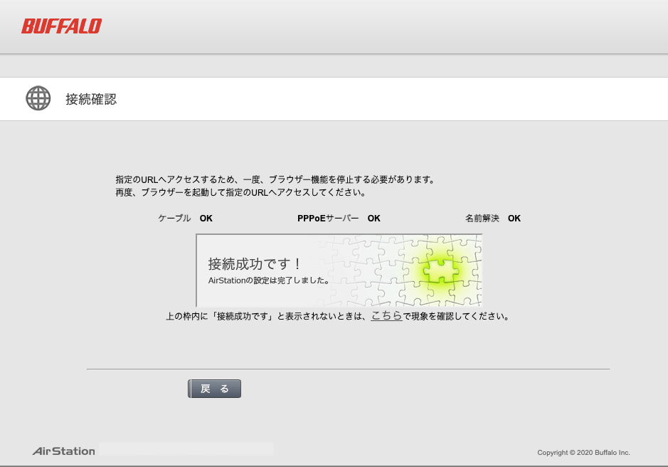これでインターネット接続完了と出れば初期設定完了です。