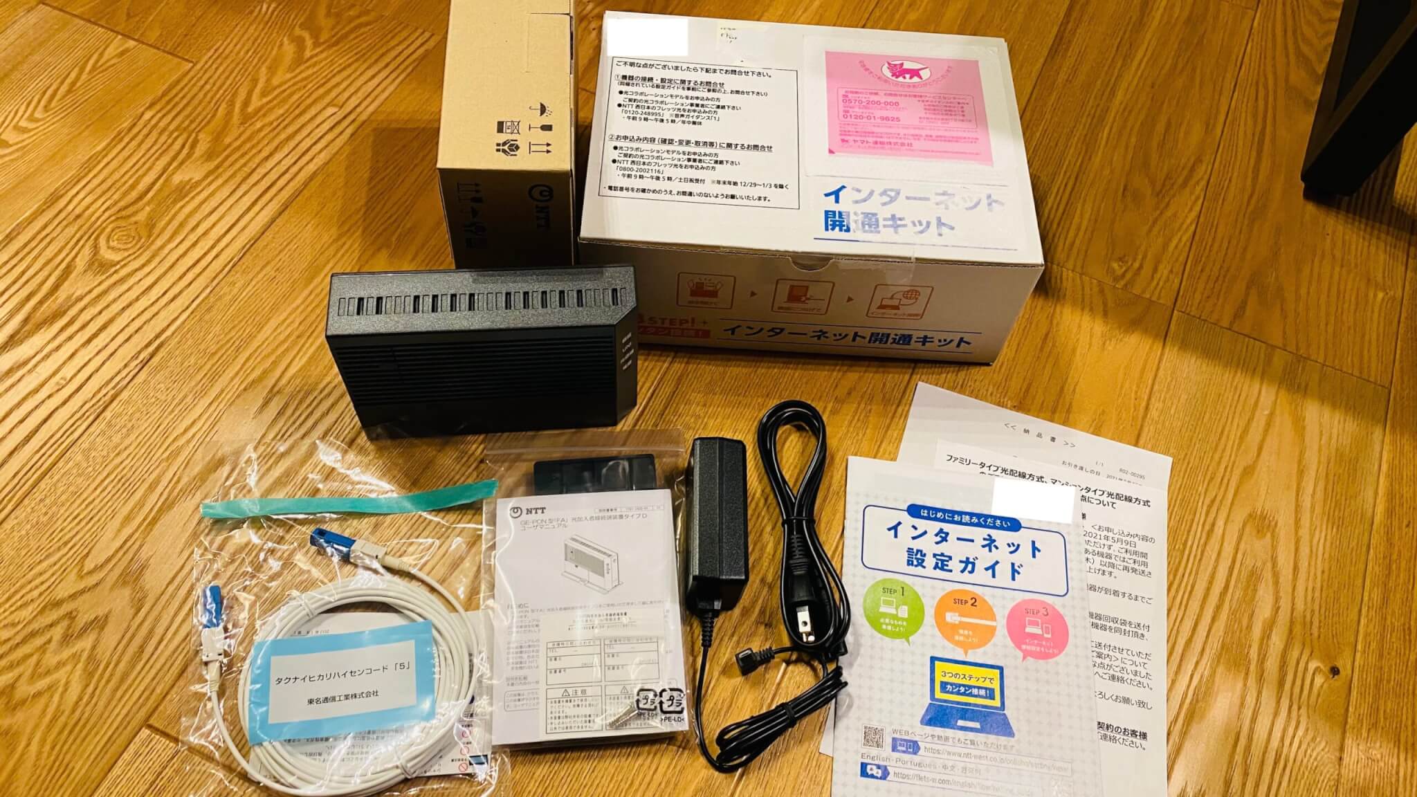 開封すると、以下写真のように終端装置、光ケーブル、インターネット設定ガイドが入っています。