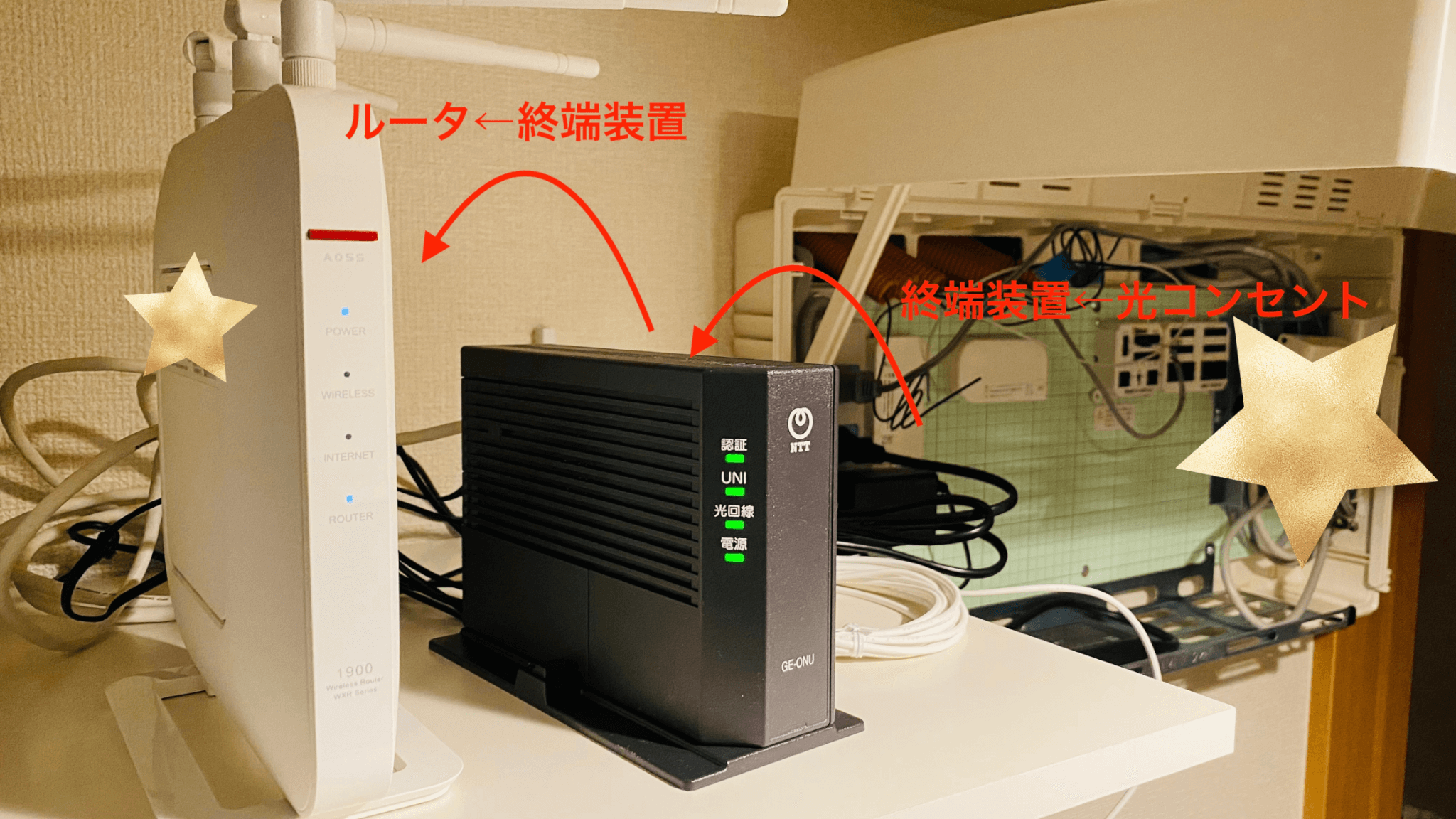 まず初めに、同封されている手順書に従って終端装置やお持ちのルーターをつないでいきます。