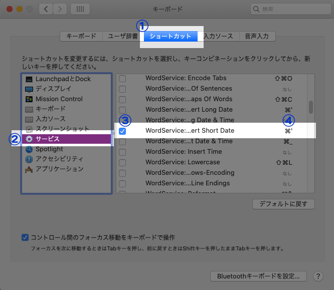 [ショートカット]タブ→[サービス]を押下し、表示されたリストから「WordSerice Insert Short Date」をON(チェックを入れた状態)にします。