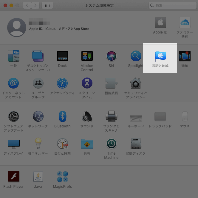 [(リンゴマーク)]→[システム環境設定]→[言語と地域]→を表示します。