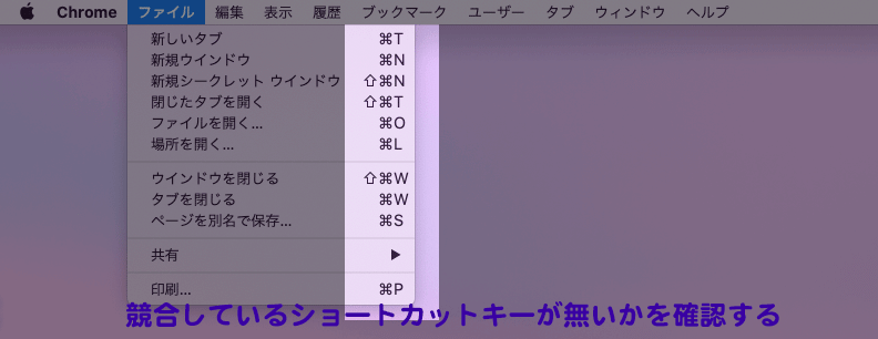 確認方法は、Chrome上でショートカットを押下した際にメニューバーのどこが反応しているかを確認してください。