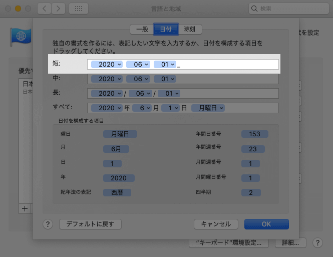 登録コマンドに1と書きましたが、これは従来の書式設定の短(short date)を指すようです。