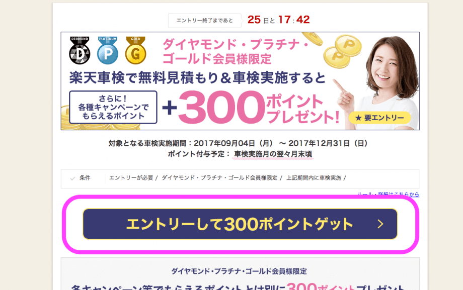 楽天ダイヤモンド会員は、ダイヤモンド会員専用ページに+300ptを受け取れる広告があるので、必ずエントリーしましょう。