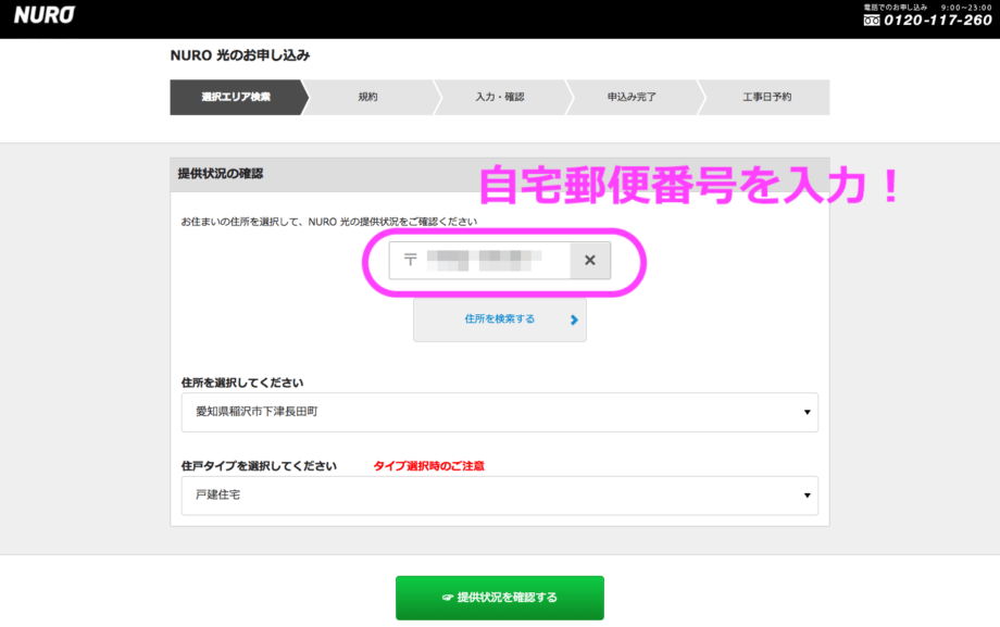 申込には、自宅郵便番号を入力し、NUROの光回線が届くかを調べる必要があります。