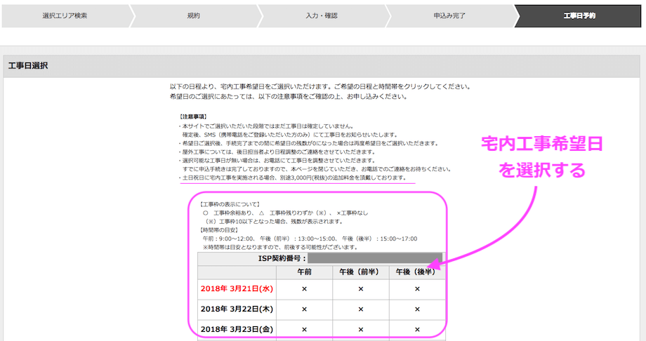 入会申込完了後、引き続き宅内工事希望日を選択する画面が表示されます。