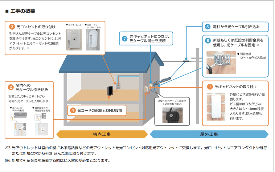 NURO光の利用開始までには「宅内工事」と「宅外工事」の2工程(別日で2日必要)を踏む必要があります。