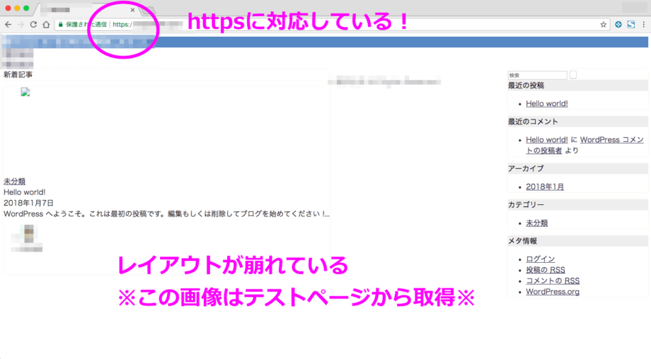 この時点では、あなたのサイトの全ページがhttpsに対応した訳ではないので、以下画像のように表示が崩れていると思います。