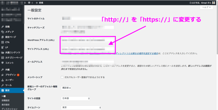 WordPressの管理画面→[設定]→[一般]へと進み、Wordpressアドレスとサイトアドレス内のhttp://をhttps://に変更します。