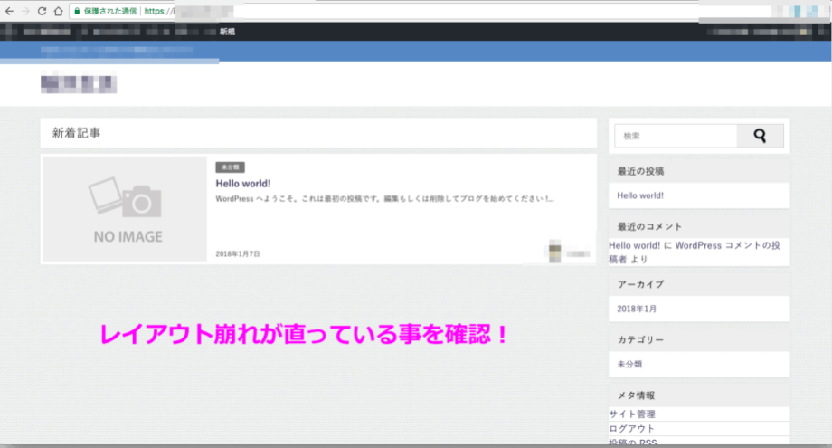 WordPressの管理画面からURLを変更する事によって、スタイルシート等が正常に反映され、WEBサイトのレイアウト崩れが解消されているはずです。確認しましょう。(以下画像を参照)