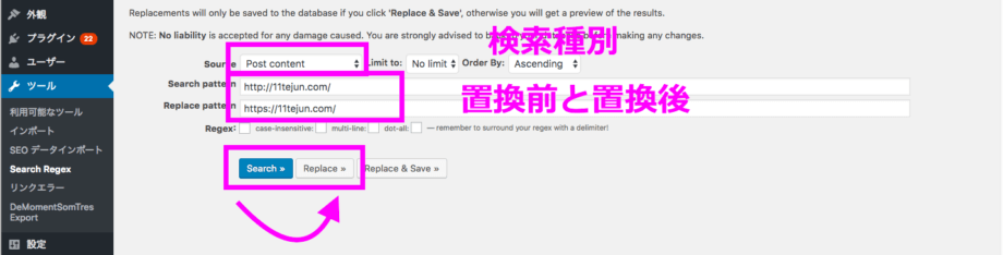 以下画像のように、「search pattern」には置換前のURL(http://のURL)を、「Replace pattern」には置換後のURL(https://のURL)を記載します。
