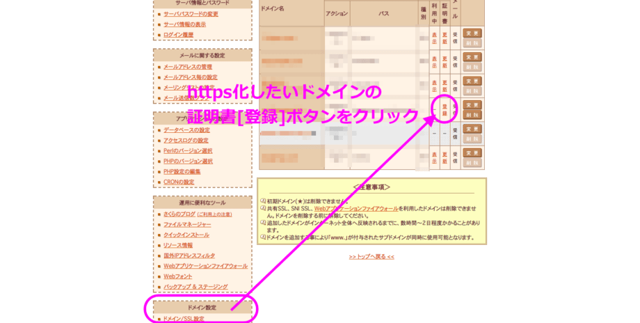 左側のメニューの中で[ドメイン/SSL設定]→https化したいドメインの証明書列の[登録]を押下します。