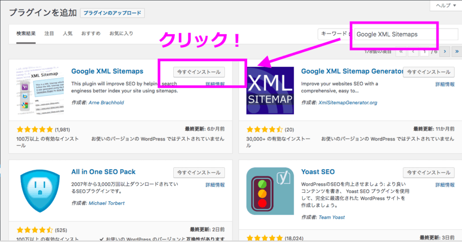 まずは「Google XML Sitemaps」というプラグインをインストールしましょう。