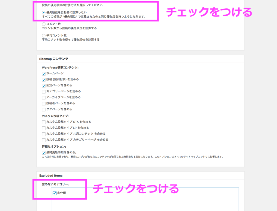 そして「(サイトマップ作成に)含めないカテゴリ」を”未分類”カテゴリにチェックをつけておきましょう。