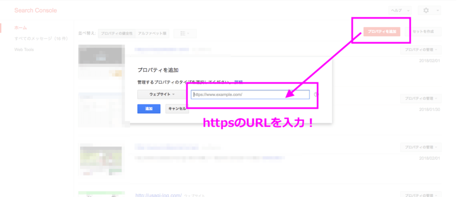 次に、サーチコンソールを使用してgoogleに「URLがhttpsに変わったよ−!」と連絡していきます。